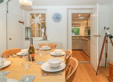 Passing the classic wooden dining table which seats the whole group, you can continue into the kitchen, with sleek grey units holding all you need to rustle up tasty meals.