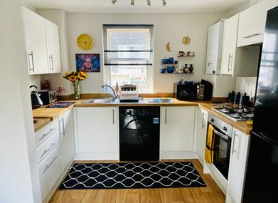 Open plan to the living area is a very well-equipped kitchen with washer dryer, full-size fridge freezer, built-in electric oven and gas hob, microwave, kettle, toaster, panini press, sandwich and waffle toaster.