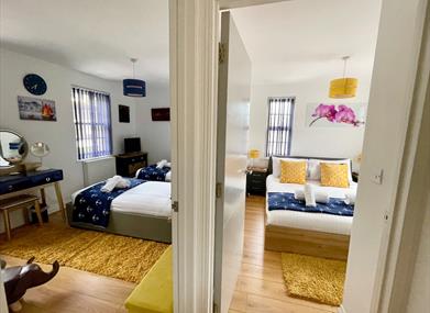 Bed 2: Large twin dual aspect bedroom with 24” smart TV with DVD, large built-in wardrobes and storage.