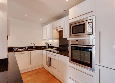 Full utensils and accessories including a microwave, kettle, toaster and cafetiere