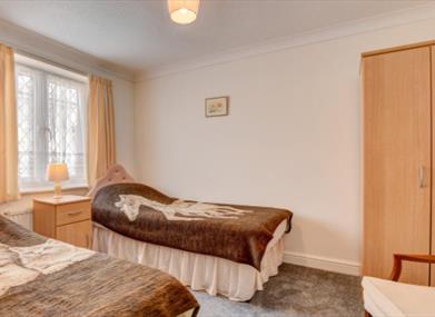 The second bedroom furnished with 2 single beds, wardrobe and bedside table.