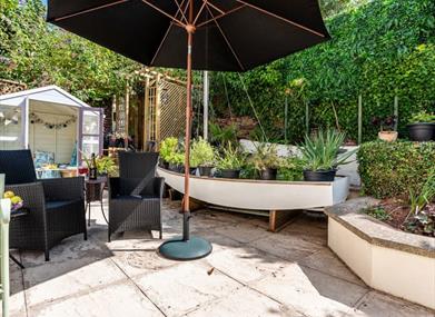 To the front is a large delightful patio area with a nautical theme which continues into the quaint summer house. This hideaway at the bottom of the garden is ideal for escaping for a few minutes. Bistro seating and a parasol are provided for your comfort.