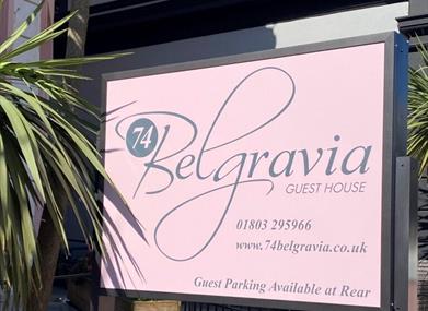 Take the left fork towards Torquay and Newton Abbot (A380)At the Penn Inn roundabout in Newton Abbot take the 2nd exit onto Torquay Road - A380 signposted to TorquayGo through Kingskerswell passing the Hare & Hounds Pub on your leftAt the Kerswell Gardens roundabout (pile of rocks) take the 1st exit straight onto Riviera Way - A3022 - to TorquayContinue straight on to Torre station taking the left fork. Continue to the traffic lights at Torre Marine....now take the right hand lane signposted Harbour Brixham Paignton and go straight through the next lights to South Street (the Police Station is on your right)Bear left at the bottom of the hill into Belgrave RoadYou will find us just past the shops - the first building in the terrace of guesthouses on the right - with our 74 logo and we are pink!