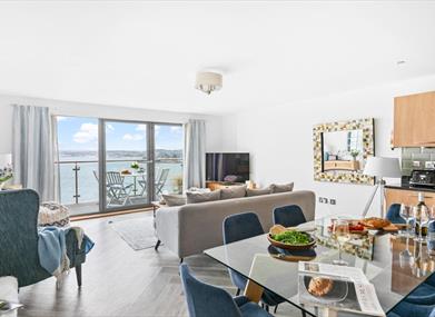 Oozing high-end seaside charm, this beautiful apartment is a sociable space: the perfect pad for a relaxing holiday with friends and family. Inside, you’ll find a large open-plan kitchen, dining and comfy living room leading out to the private balcony. The contemporary grey and cool white decor accentuates the dazzling blue sea beyond the large folding glass doors. Relax on the large sofa to make the most of the gorgeous views in cooler months or head out onto the balcony on fine days.