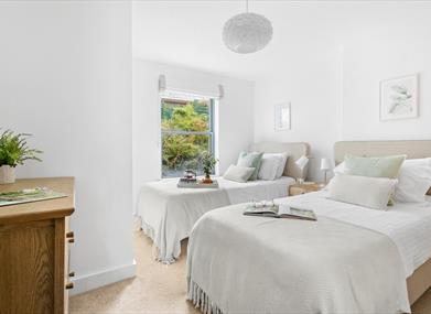 When the day draws to a close, you’ll find three beautifully styled bedrooms with leafy green views. The airy super-king master bedroom is comfortable and bright, with a modern ensuite walk-in shower. The second double bedroom and twin room are fresh and cosy, with a real home-from-home vibe without the stress. There’s also a spa-inspired neutral family bathroom down the hallway.