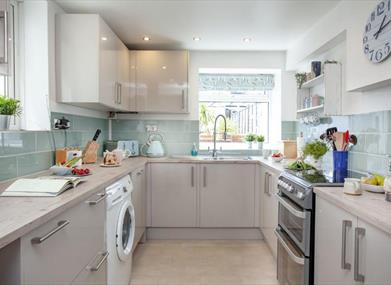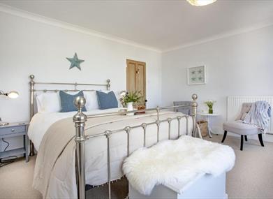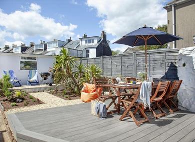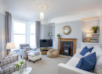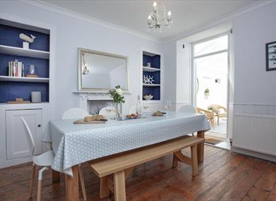 This beautiful property can be found perched above the bay in the pretty Furzeham area of Brixham. Wonderfully positioned to enjoy the best of the town, the cottage is within easy reach of the vibrant quay and harbour in one direction and Battery Gardens and Fishcombe Cove in the other, so for families or groups of friends it’s the perfect place for a holiday! Set over three floors, Admirals pairs contemporary coast-inspired décor with original period features like an Arts and Crafts fireplace and decorative tiles, stripped wood flooring, dipped oak doors and ceiling roses with chandeliers. On the ground floor there’s a gorgeous living room with big bay windows and a spacious, fully equipped modern kitchen with breakfast bar and seating. A large separate dining room with chunky wood table and seating flows through to the sun room where guests can relax with a cup of coffee and a good book, while the furnished garden to the back of the property is a wonderful place for barbecues and fresh air entertaining.