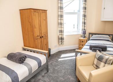 Babbacombe Apartments consist of a three bedroomed holiday apartment in Babbacombe Torquay rooms consist of a kingsize bedroom a double bedroom and a twin room private bathroom kitchen and lounge.