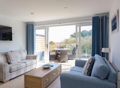 Open plan and furnished in a coastal theme, patio doors span the full width of the living space, furnished with two attractive sofas where you can catch up on any missed TV shows with a Smart wall mounted TV with Netflix.
