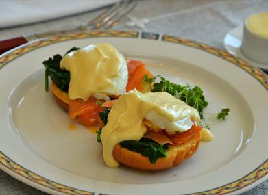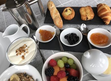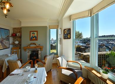 Breakfast is served in the Captain’s lounge, next to the Galley, which is a beautiful, bright room, with a huge bay window offering wonderful views of the marina, breakwater and beyond. You can hear the seagulls…. The room also has a number of paintings and pictures which were in our late fish restaurant, “The Lobster Pot” in London for 25 years, they found an appropriate new home here.Wherever possible we source produce locally and everything is freshly prepared, from the range of cereals and jams to the various cooked options there is always something for the most demanding palates. A sample menu can be viewed here.