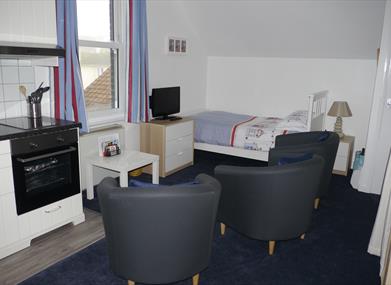 The distinguished detached property was built in 1902 and is set in its own spacious grounds. It provides 13 apartments ranging from studios to 2-bedroomed apartments and accommodating from 1 to 7 people. There is considerable flexibility in the accommodation to enable us to meet most requirements as well as the important little extras such as onsite laundry facilities, free upgraded WiFi, book and dvd library, board games and beach equipment for guests use.