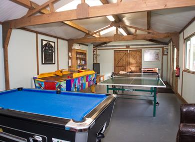 Spacious games barn with table tennis, pool, air hockey, darts, Xbox, board games, and table football