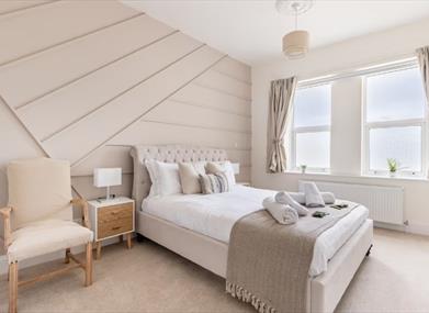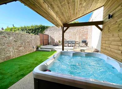 The garden at the front features an under cover area with the hot tub and a large patio with outdoor dining table.Sleeping arrangements include a principle suite with an en suite bathroom that has a TV and sea views . Bed 2 also has an en-suite, TV and views of the sea. There is another en-suite bedroom and then two other bedrooms share the family bathroom