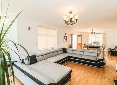 Be welcomed into the living/dining room following a day of adventures, sprawling out on the huge C-shaped sofa placed perfectly before the large Smart TV on the wall and the contemporary electric fireplace.