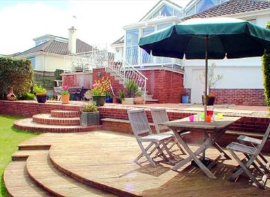 Outside: Furnished terraces, garden and lawn, decked area, seating.