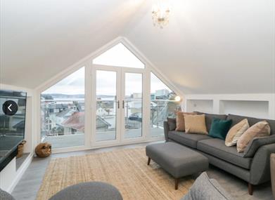 Follow the stairs up to the first floor, where you will find a stylish and large toilet/shower room, and an impressive sitting area, featuring a full apex window, a good sized balcony with table and 2 chairs, and impressive views out over the town and out to sea.