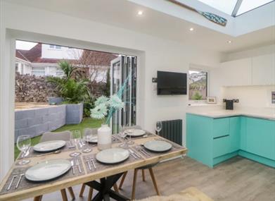 The kitchen can be fully opened up to the garden via a set of patio doors and a bi-fold door.