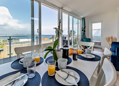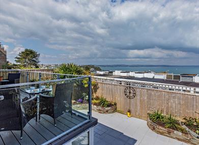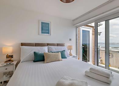From the lounge, you can head to the garden or balcony. The fully enclosed, paved rear garden provides wonderful, covered storage for any of your holiday equipment like bikes and kayaks. Meanwhile, the beautiful balcony has outdoor bistro sets for dinner and drinks overlooking the coastline.
