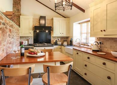 With its high ceilings, exposed beams and breakfast bar, the full appointed kitchen offers a wonderfully sociable space for cooking together.