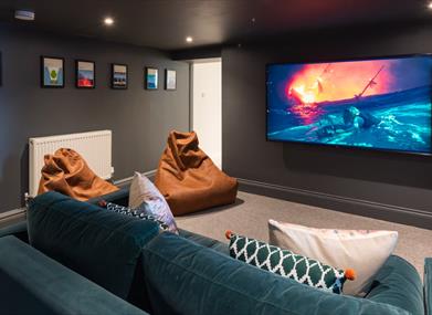 The light and airy lounge features a super comfy sofa with a Samsung Frame TV and wi-fi, but for that truly big screen experience head downstairs to the cinema and games room where you’ll find comfortable seating, beanbags and a super-size screen. Movie nights don’t get more impressive than this, so grab some popcorn, settle back and enjoy the show!