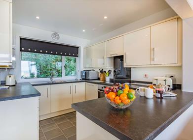 Kitchen area: With electric cooker, microwave, fridge, freezer, dishwasher and washer/dryer.
