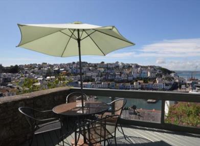 Three-bedroomed cottage overlooking the harbour in the English Riviera town of Brixham, with a fantastic decked balcony offering views out to sea.