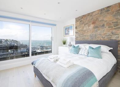 Top floor: Large king size bedroom – engineered wood floors, full height sliding glass doors to balcony, panoramic sea and harbour views, fully tiled en-suite bathroom with large walk-in rainfall shower, wash basin & W/C