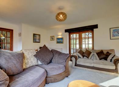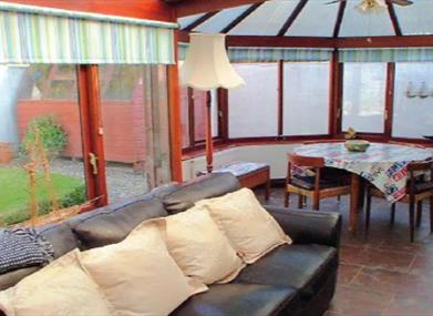 The living room has two plush sofas, a large flat screen tv with freeview, a dvd player and a wooden coffee table. The doors in the living room lead onto the communal front courtyard and also rear doors that lead to the conservatory. Wi-fi is also available.