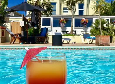 The Cimon is set in a magnificent 1860’s detached Victorian villa retaining many original period features combined with modern comforts. Our guests can enjoy the use of two comfortable relaxed seating areas and the residents well-stocked bar, with board games at the ready. The bright and airy breakfast room looks out over the large patio with tropical plants and our 30ft swimming pool. From May to September our pool is open and heated – we offer sun-loungers and complimentary pool towels with a south facing aspect we can have sun all day. There is plenty of space on the two terraces for relaxing under a palm or two. The Cimon benefits from plenty of free onsite parking and we offer free access to fibre optic wifi throughout.