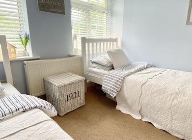Twin beds, bedside tables with lamps and freestanding wardrobe