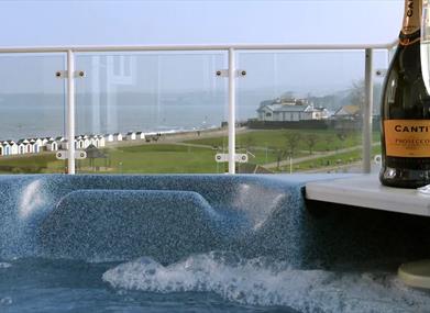 The floor to ceiling glass doors lead out onto an impressive balcony with sun loungers and dining furniture but even better, enjoy the view from the huge spa for a feeling of complete and utter luxury.