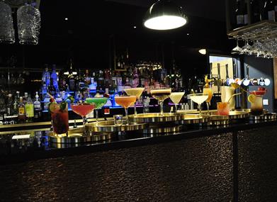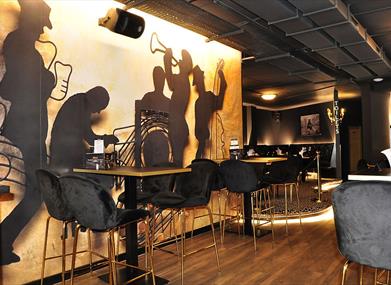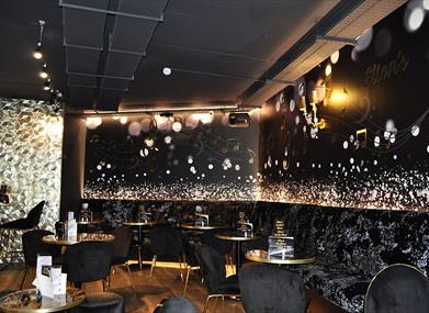 Elton's is a unique themed and sophisticated music venue providing a diverse cocktails, gins, champagne and beverage drinks menu running alongside this is a tapas food from around the restaurant .
