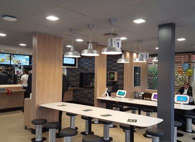 A famous brand restaurant and takeaway with a front counter, ordering screen or app to order your favourite fast food. An efficient and courteous table service is also available. Serving British and Irish beef, happy meals, breakfasts and vegetarian options.