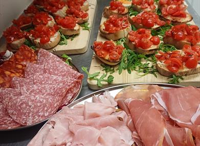 Fresh healthy food, homemade bread, focaccia, pizza, pastry, cake and more