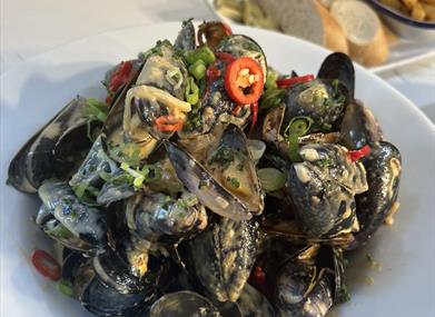 Come down and enjoy a pint in the sun with a beautiful seaside view, with a selection of food.