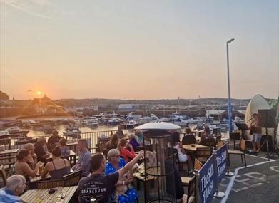 A casual bar and harbourside venue with waterfront outdoor seating and panoramic views of the bay.