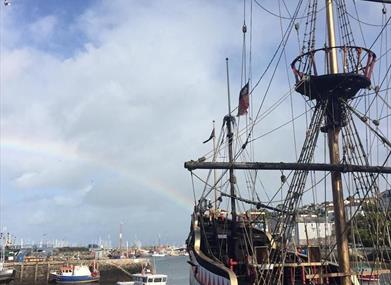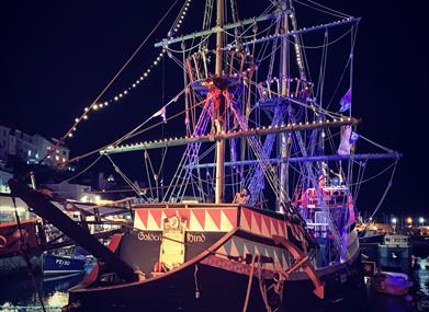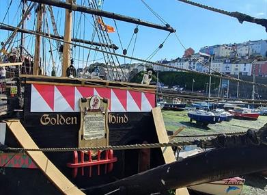 The Golden Hind at Brixham, Devon is a full sized replica of one of the most iconic ships from the age of exploration. The Ship has been a feature of picturesque Brixham harbour for over fifty years, entertaining and educating thousands of visitors during this time - as well as being featured on many television programmes and films. The Ship is open come rain or shine and is an all weather attraction with many indoor displays as well as wide open decks.