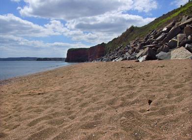 Hollicombe Beach in Torquay a sandy, rocky beach surrounded by high cliffs.
