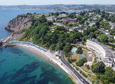 A mile from Torquay harbour and in a stunning location at the bottom of a row of imposing cliffs. Grab a deckchair and enjoy the sound of the sea lapping against the shore, or wander along the promenade lined with a colourful row of beach chalets. A popular beach café can be found here too.